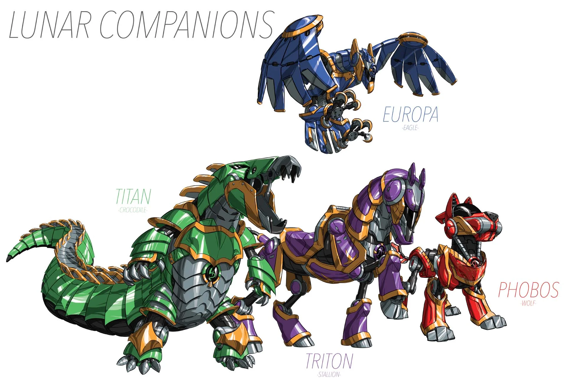 Influenced by the things I loved growing up, such as Transformers, Power Rangers, Ninja Turtles and the Rocketeer, with a hint of Avengers and Game of Thrones, Rocket Knights was my most challenging creation for Gemma due to the technical nature of armour design combined with the use of human and animal forms. I loved working on it though!